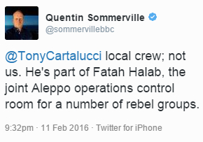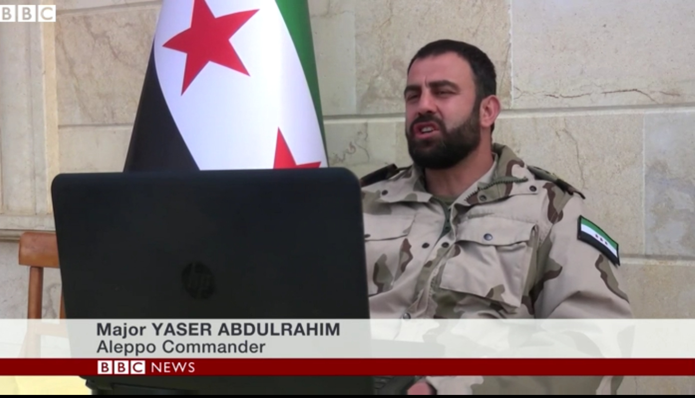 In a recent video report published by the BBC titled, "Syria conflict: Rebels 'feel abandoned' by Britain and US," BBC's Quentin Sommerville claims he "secretly" contacted US-backed rebels from Turkey. The alleged "remote" interview was covered in both locations by professional camera crews, despite Sommerville claiming the situation was so bad, the rebels could not be reached. The "senior rebel commander inside Aleppo" interviewed by the BBC was none other than Yaser Abdulrahim,